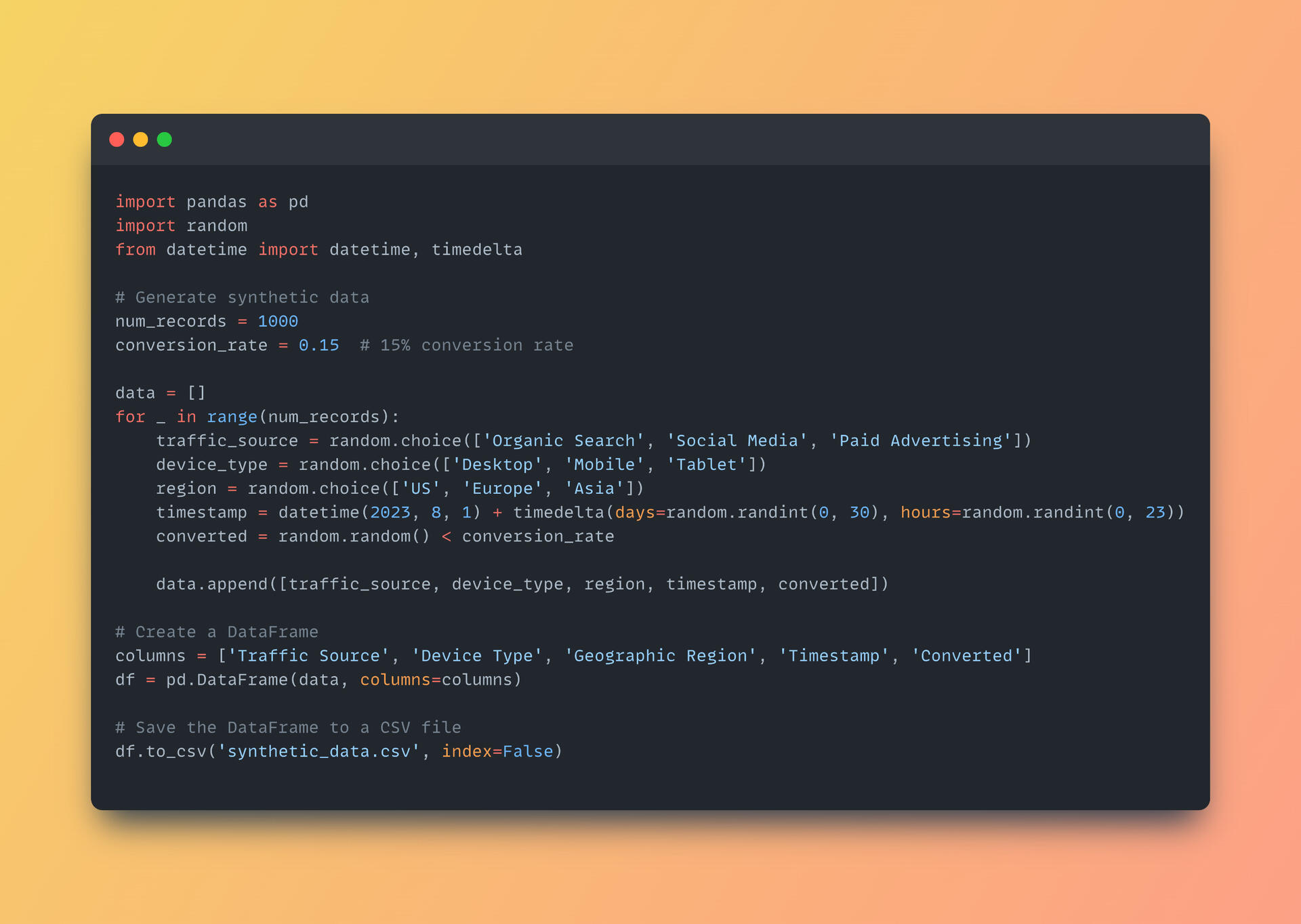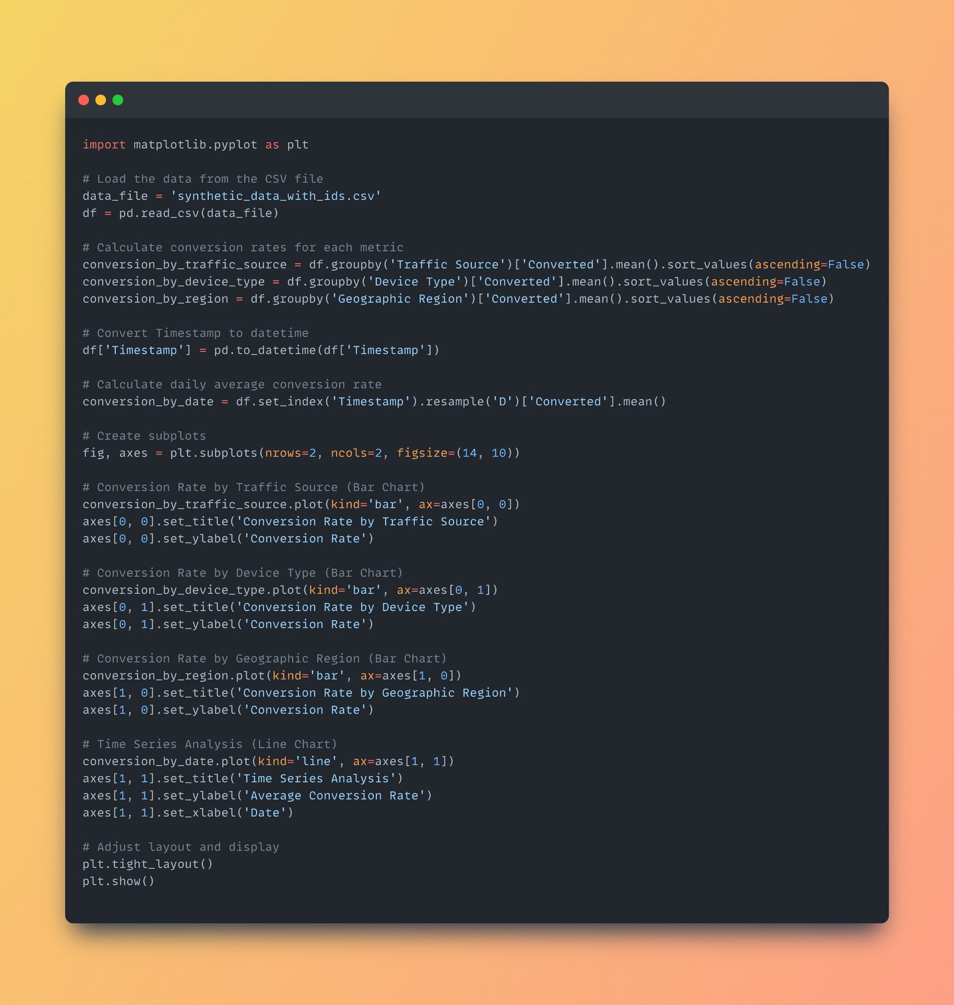 Created a dataset and visual analysis using Pandas and Matplotlib.First, I created the dataset using the Pandas library. This gave me 1000 rows of random marketing data detailing sales conversion rates.