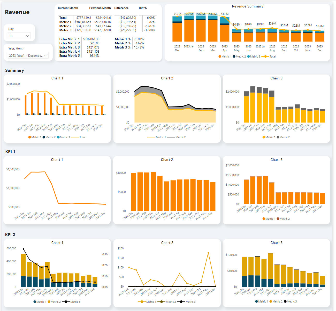12 individual reports were then created to track revenue for each service.Overview tab: