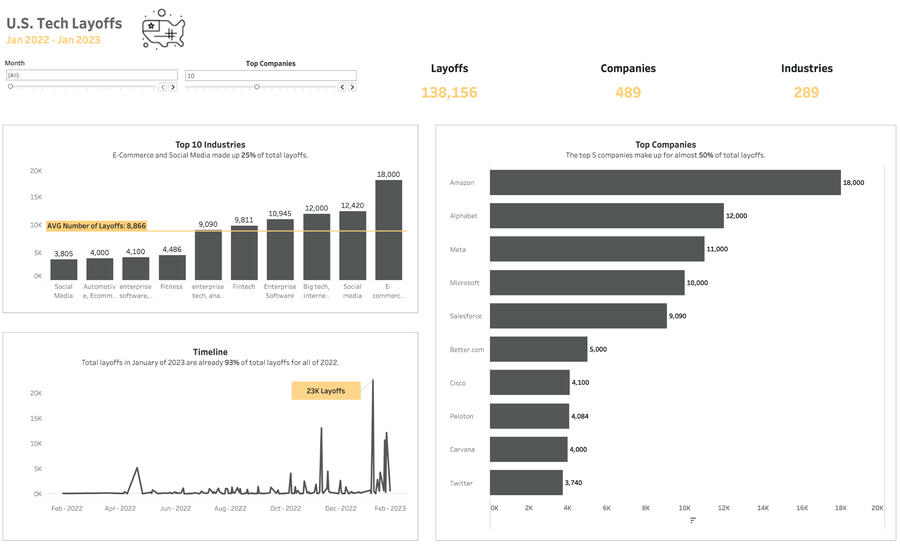 The full project can be viewed on my Tableau Public page: https://public.tableau.com/views/USTechLayoffs/Dashboard1?:language=en-US&:retry=yes&:displaycount=n&:origin=vizshare_link